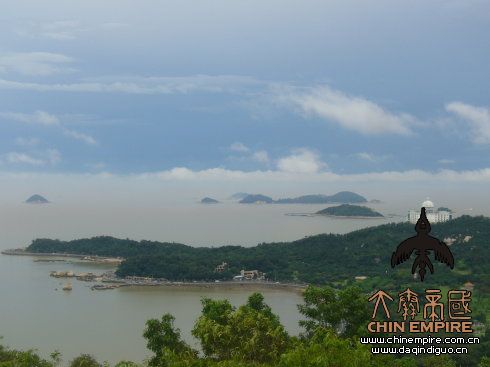 珠海海滨远眺,淡云轻雾若仙山天河。白色圆顶建筑,是国际会议中心。